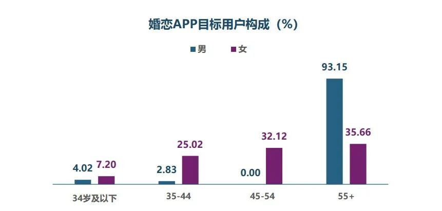 根据民政局的数据,2023年和2024年登记结婚人数从768.21万对下降到610.6万对,降幅高达20.5%。CSM全媒体数据(NewTAM)显示,仅以今年2月14日情人节当天为例,使用婚恋APP的用户中,34岁及以下的适婚人士占比极低,男性只有4%,女性也仅占7.2%,反倒是父母辈的55岁及以上的老年人占比极高,移动生活中的一个侧面印证了“孩子不急,老人急”的婚姻社会生态现状(图1)。