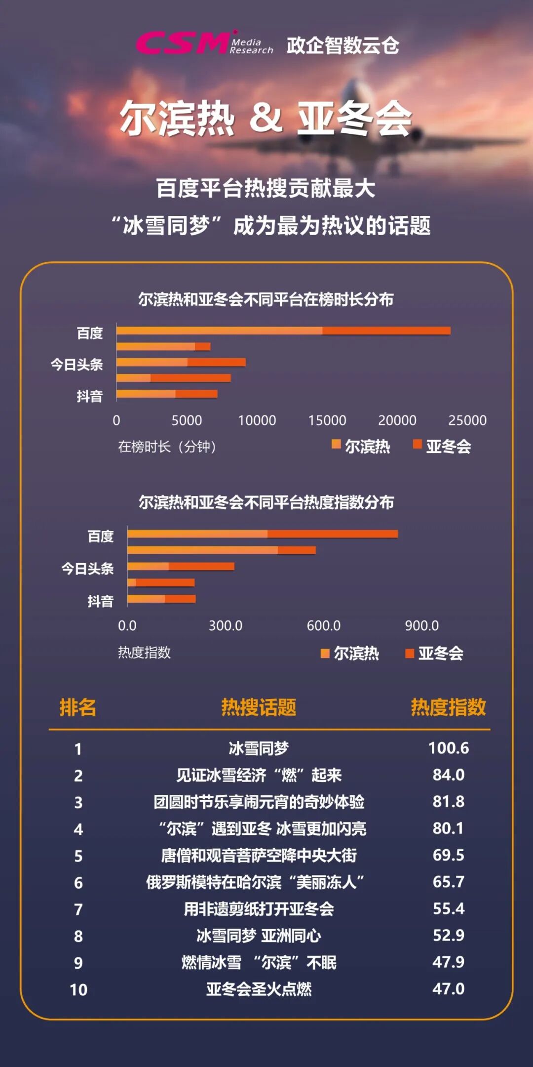 当哈尔滨的冬天来临之际,尔滨的 “宠外地游客” 模式又开始了。南方小土豆、东北虎、俄罗斯模特、搓澡这些去年热搜话题的常客今年依旧被热议,唐僧和观音菩萨、张诗尧、“兵马俑”冰雕等新的“NPC”在今年热搜话题上悉数登场。不过,今年哈尔滨最热议的当属举办亚冬会盛事。根据CSM 智数云仓的统计数据,亚冬会相关话题的在榜时长和热度指数占据“尔滨热&亚冬会”事件在榜时长和热度指数的42.0%和46.1%。其中百度平台贡献最多的在榜时长和热度指数,在微博和今日头条平台,“亚冬会”相关话题的在榜时长和热度指数比“尔滨热”相关话题还高。从具体话题热度指数 TOP10 观察,“亚冬会”相关的话题占据了七个席位,体现了“亚冬会”的热度,其中“冰雪同梦“见证冰雪经济‘燃’起来”和“‘尔滨’遇到亚冬 冰雪更加闪亮”位列第一、第二和第四席位;“尔滨热”相关具体话题“团圆时节乐享闹元宵的奇妙体验”和“唐僧和观音菩萨空降中央大街”则排名第三和第五位置。