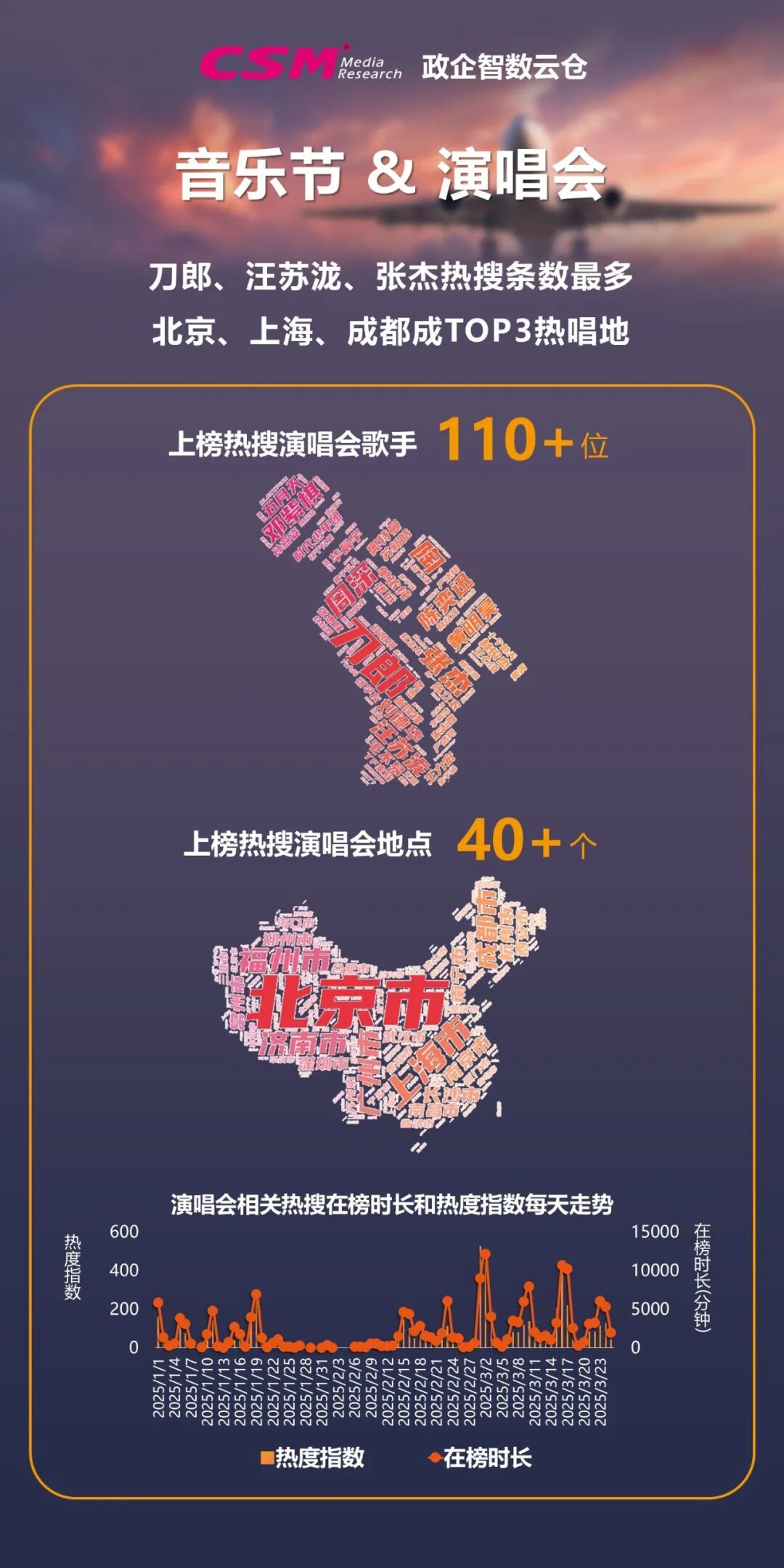 演唱会与文旅的关联日益紧密,演唱会为文旅产业注入活力,文旅资源为演唱会提供场景创新。二者通过文化消费、城市品牌塑造、经济拉动等方式形成了深层次的互动关系,并在政策推动下得到协同发展。2025年第一季度演唱会遍地开花,新老歌手齐聚,歌手组合频出,甚至奥特曼都开起了主题演唱会。根据CSM智数云仓的统计数据,“音乐节&演唱会”相关热搜标题中,共有超过110个歌手和组合被提及,其中“刀郎”和“汪苏泷”冲上热搜最多。“刀郎”的热搜主打情怀,如“刀郎上海演唱会40岁以上观众过半”“83岁老母亲陪女儿来看刀郎演唱会”“刀郎演唱会抢票成尽孝新赛道”;“汪苏泷”热搜多聚焦于其歌曲和表演本身,如“起猛了 汪苏泷跳女团舞了”“汪苏泷演唱会全明星阵容”“欧阳娜娜陈妍希去看了汪苏泷演唱会”等,可以看到汪苏泷自带的话题度。此外,张杰、周深、邓紫棋、陈奕迅和刘德华等均有超过20条相关热搜。组合方面,被提及最多的是“时代少年团”,而提及的内容更多是其音乐会以及团员本身。“音乐节&演唱会”相关热搜所属城市中,北京、上海、广州三大城市位居前列,成都、福州、杭州、济南和南宁等地也有20条以上热搜。从分天走势观察,除了春节期间,其余时间段均有较高的热度,整个季度几乎天天“打榜”。