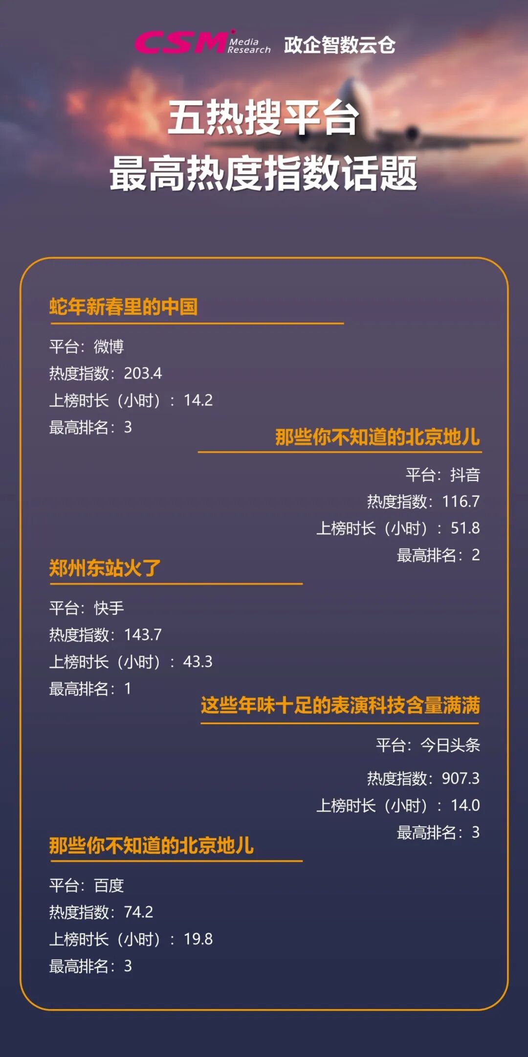 由于不同平台用户群体画像、内容生产机制、算法推荐逻辑、平台运营策略、内容消费形式和商业化生态等的差异,不同平台最高热度热搜话题各有特色。在微博平台,“蛇年新春里的中国”成为热度指数最高的话题;在抖音和百度平台中,热度指数最高的话题则是“那些你不知道的北京地儿”;在快手平台,“郑州东站火了”话题热度指数最高;今日头条平台中,“这些年味十足的表演科技含量满满”成为最高热度指数话题。