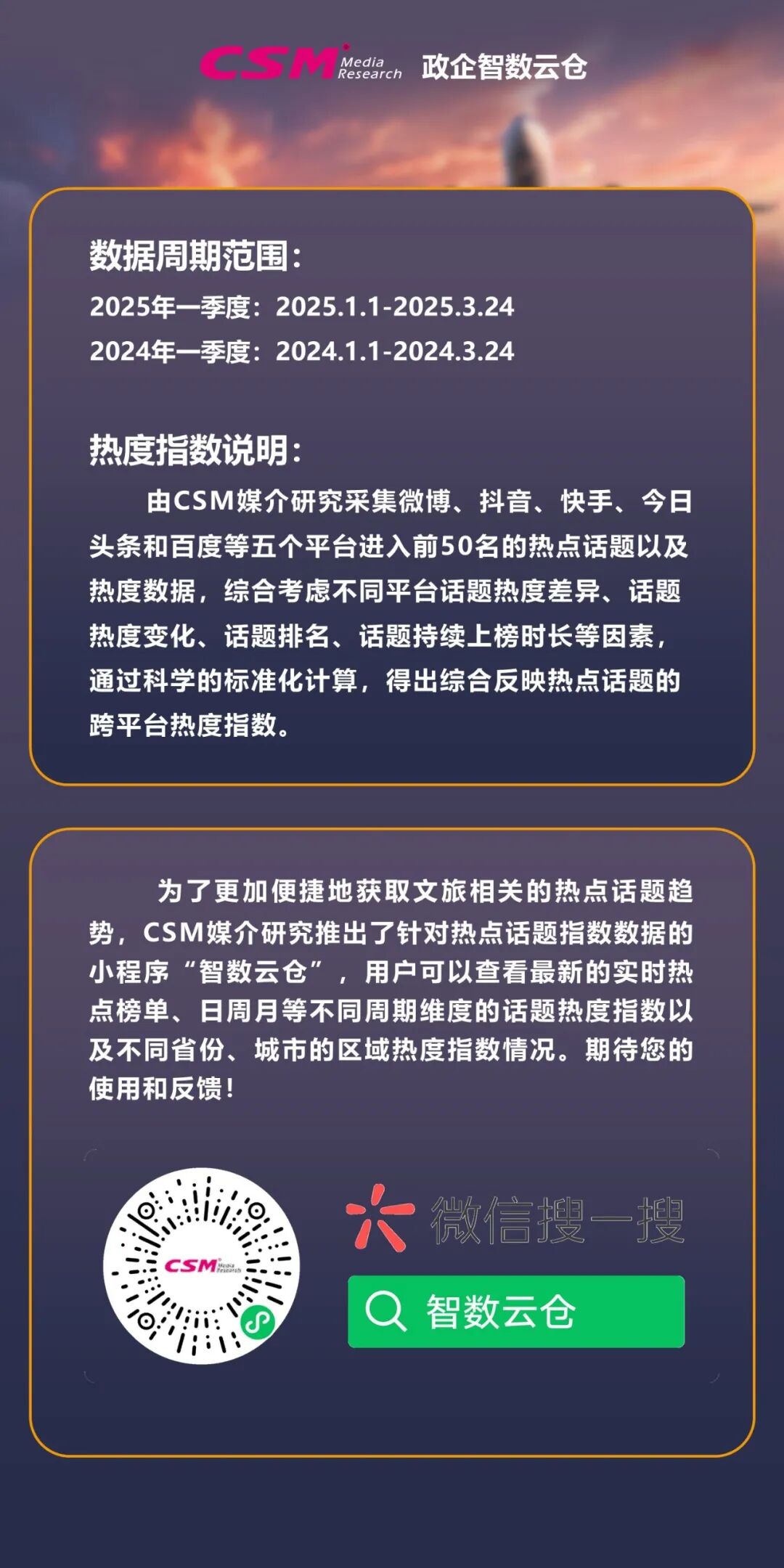 本期,跟着CSM智数云仓的统计数据,深入剖析2025年第一季度文旅市场的热度趋势、地域格局、热点事件,一同探寻文旅市场蓬勃发展背后的深层逻辑。