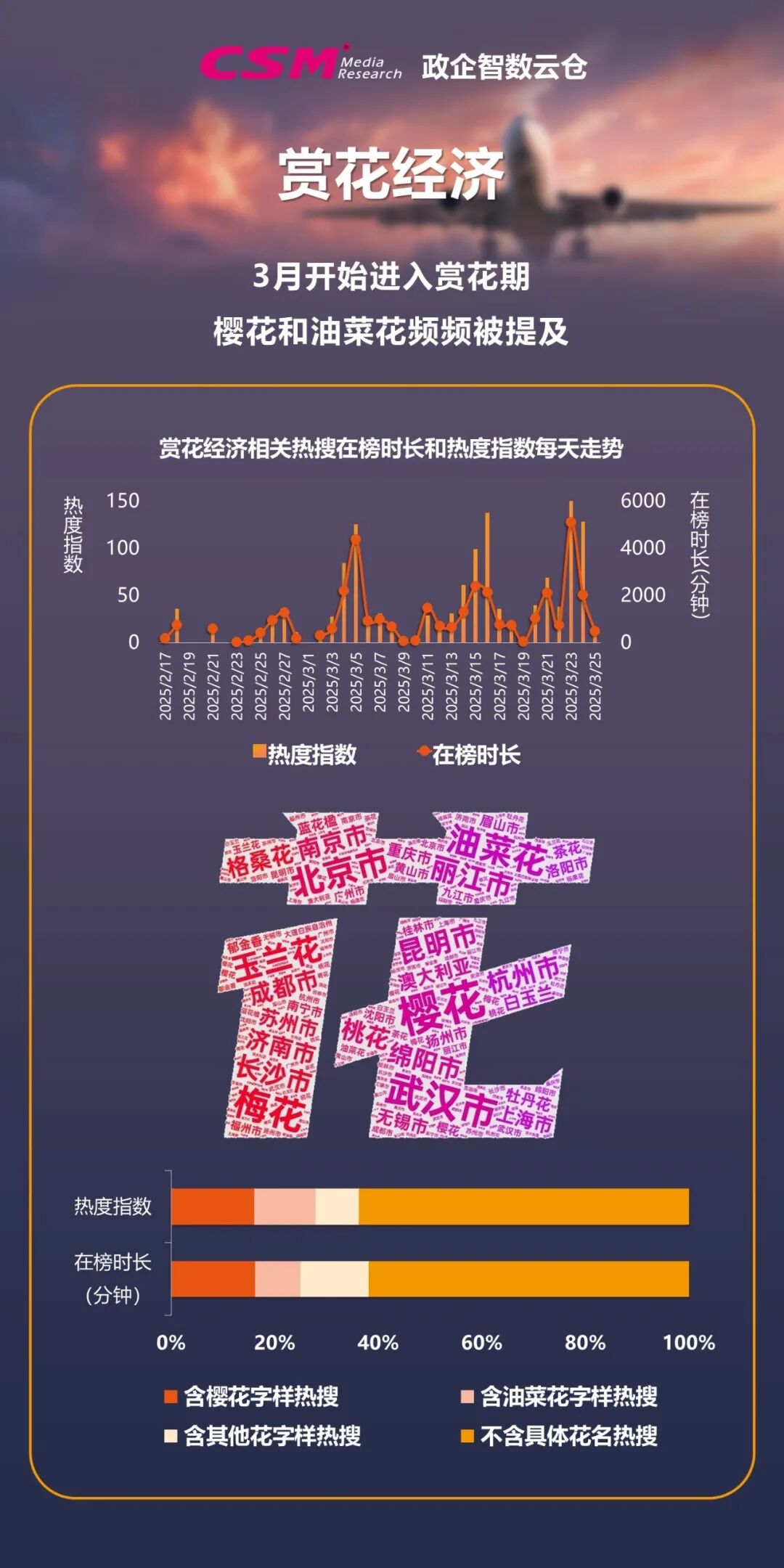 “赏花经济”一词在官方文件中被广泛使用的情况出现在2020年初。多地将其纳入乡村振兴战略规划,强调花卉资源的经济转化潜力。随着消费需求多元化及政策推动,“赏花经济”与文旅产业通过文化、科技、产业链延伸实现深度融合,形成“花开百业兴”的复合型经济模式。每当春天花开时,“赏花经济”话题便紧随出现。从赏花经济相关话题在榜时长和热度指数走势数据观察,进入2月中旬后,相关话题在榜时长激增,热度指数也居高不下,“樱花”和“油菜花”相关话题出现最为频繁。含“樱花”字样话题的在榜时长和热度指数占据“赏花经济”事件在榜时长和热度指数的16.2%和15.9%,含“油菜花”字样热搜则是占比8.7%和11.9%。作为樱花之城的武汉,理所当然地成为了“赏花经济”的热搜城市,如“武汉樱花变‘冰糖葫芦’”和“武大樱花迎来最佳观赏期”话题均带有高热度。北京故宫的玉兰花也多次把北京带上热搜。四川眉山的 2000 余亩油菜花竞相绽放,橙红、浅紫、乳白等七种花色的彩色油菜最亮眼,把“七彩油菜花美得像莫奈花园”话题推上了“赏花经济”相关热搜话题热度指数的第一位。