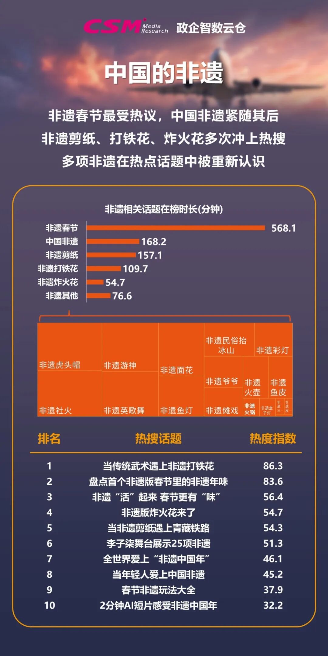 根据CSM智数云仓的统计数据,“非遗春节”在榜时长和热度指数占据“非遗”在榜时长和热度指数的46.4%和50.1%,成为“非遗”中绝对的主角。2025年春晚也将多个非遗元素融入到节目中,李子柒带着十多项非遗元素登上了春晚的舞台,也带火了多个非遗话题。“非遗”在热搜上的集体狂欢也让我们认识到了非遗剪纸、非遗打铁花、非遗炸火花、非遗虎头帽、非遗社火、非遗游神、非遗英歌舞等一系列中国的非物质文化遗产,增强了我们的文化自信。“非遗”事件具体热搜热度指数排名TOP10中,有 5 个热搜是关于“非遗春节”的,其中“盘点首个非遗版春节里的非遗年味”和“非遗‘活’起来 春节更有‘味’”排名第二和第三位,排名第一的则是与非遗打铁花相关的“当传统武术遇上非遗打铁花”。
