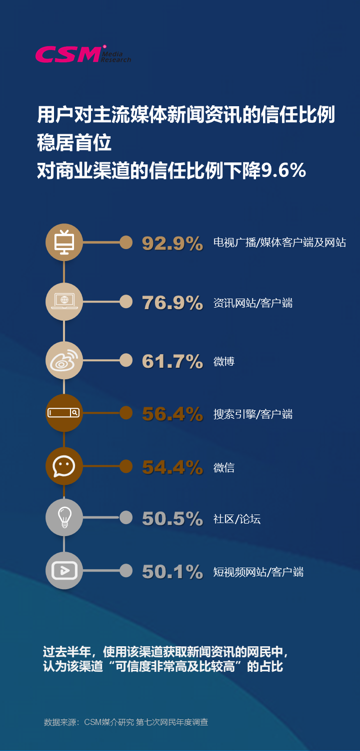 用户对主流媒体的信任比例稳居首位,商业渠道下降9.6%