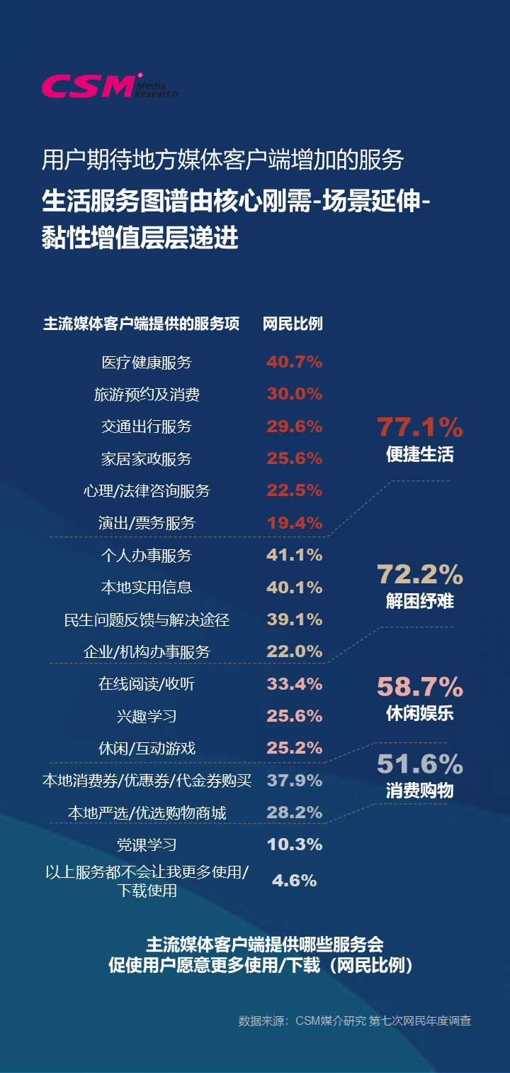 用户期待地方媒体客户端增加的服务:生活服务图谱由核心刚需、场景延伸、黏性增值层层递进。针对网民期待地方媒体客户端增加的服务,选择便捷生活、解困纾难类服务的网民占比分别为77.1%、72.2%,成为核心诉求。在调查涉及的16项具体服务中,选择个人办事服务、医疗健康服务、本地实用信息、民生问题反馈与解决途径的网民占比均在四成左右,“核心刚需”构筑基础服务项;期待增加本地消费券购买、旅游预约、交通出行的网民占比约三成,“场景延伸”升级进阶服务项。此外,期待主流媒体客户端提供在线阅读/收听、互动游戏、兴趣学习等休闲服务的网民均超25%,“黏性增值”拓展附加服务项。