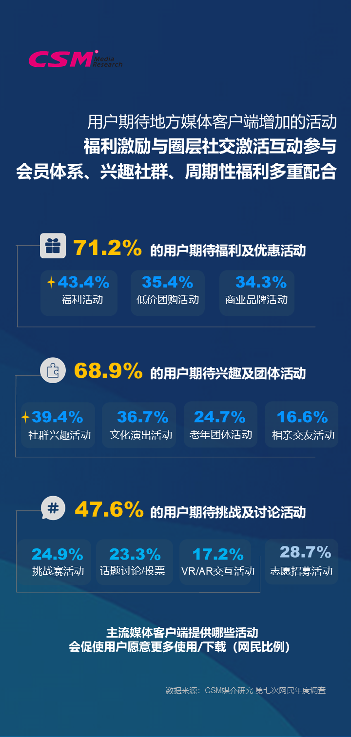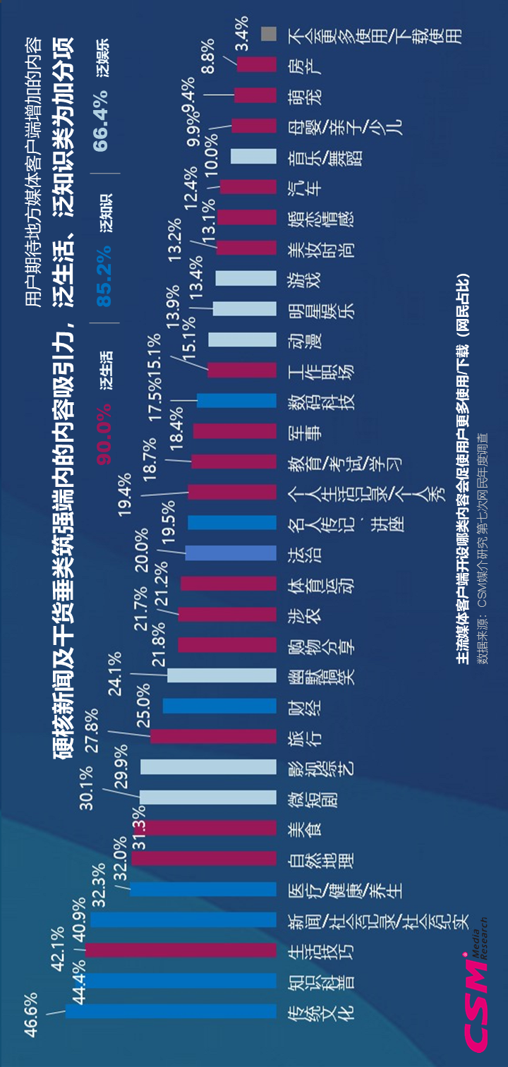 对于使用过地方媒体客户端的网民,怎样驱动他们更多地使用?94.3%的用户认为内容仍是吸引他们更多使用的核心因素,较2023年保持高位增长;关注客户端服务提供的用户占比增长最多,升至81.1%。针对地方媒体客户端,网民期待增加哪些内容、服务和活动?CSM调查显示,聚焦高频、刚需生活及消费场景,地方媒体客户端增加泛生活、泛知识类内容,强化服务及互动场域,将有望提升用户渗透与使用黏性。