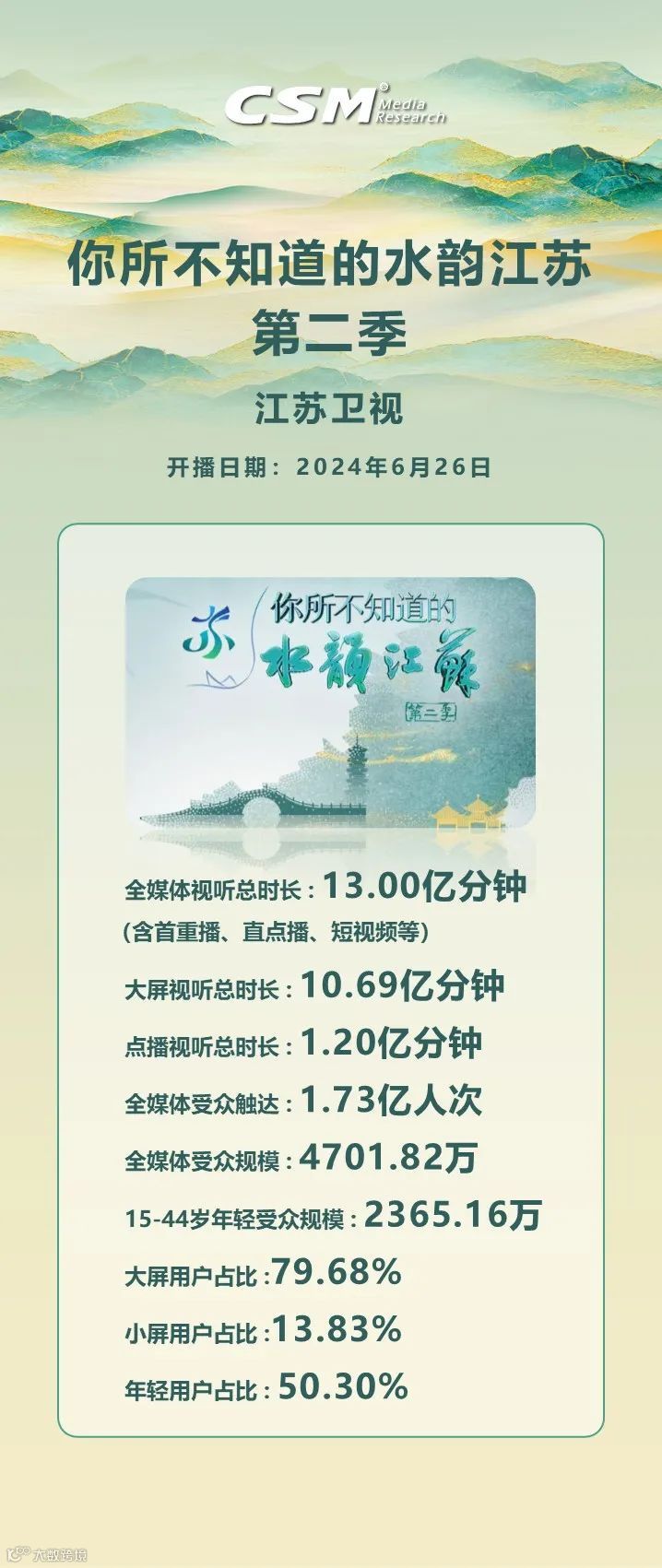 本期CSM NewTAM为您带来的是由江苏卫视精心打造的文旅深度探访融媒体节目《你所不知道的水韵江苏》第二季的全媒体收视表现。