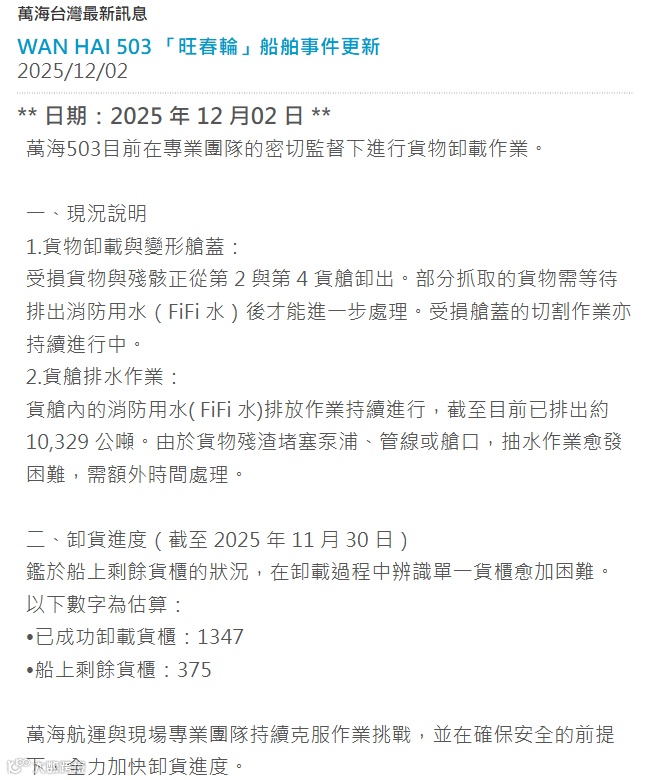 万海航运2025年12月2日更新“旺春轮”(WAN HAI 503)船舶事件最新消息:目前该船在专业团队监督下进行货物卸载,现况方面,受损货物及残骸正从第2、4货舱卸出,部分货物待排出消防用水后再处理,受损舱盖切割持续;货舱消防用水已排出约10329公吨,因货物残渣堵塞,抽水作业愈发困难。