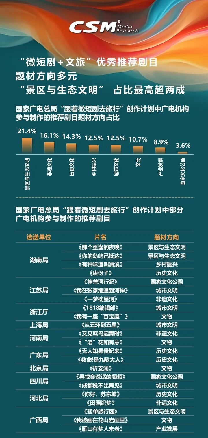 以“跟着微短剧去旅行”创作计划为例,广电机构参与制作的推荐剧目数量逐批上升,目前已占推荐剧目总量的35%,景区与生态文明类数量最多,共计12部,占比达到21.4%。此外,非遗文化、历史文化、乡村振兴等多个题材方向占比较为均衡。