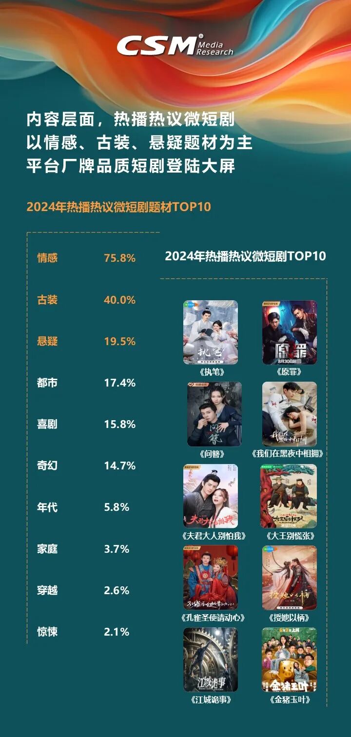 2024年热播热议微短剧的题材以情感、古装和悬疑题材为主,CSM NewTAM和其他第三方数据显示,情感题材占比达75.8%,最受用户青睐,古装题材占比达四成,悬疑题材占比近两成。热播热议微短剧TOP10中主要以古装、悬疑、甜宠等元素为主。抖音与周星驰合作的“九五二七剧场”首部悬疑微短剧《金猪玉叶》收获了3亿+的播放量和高热度,2024年还登陆卫视大屏播出。