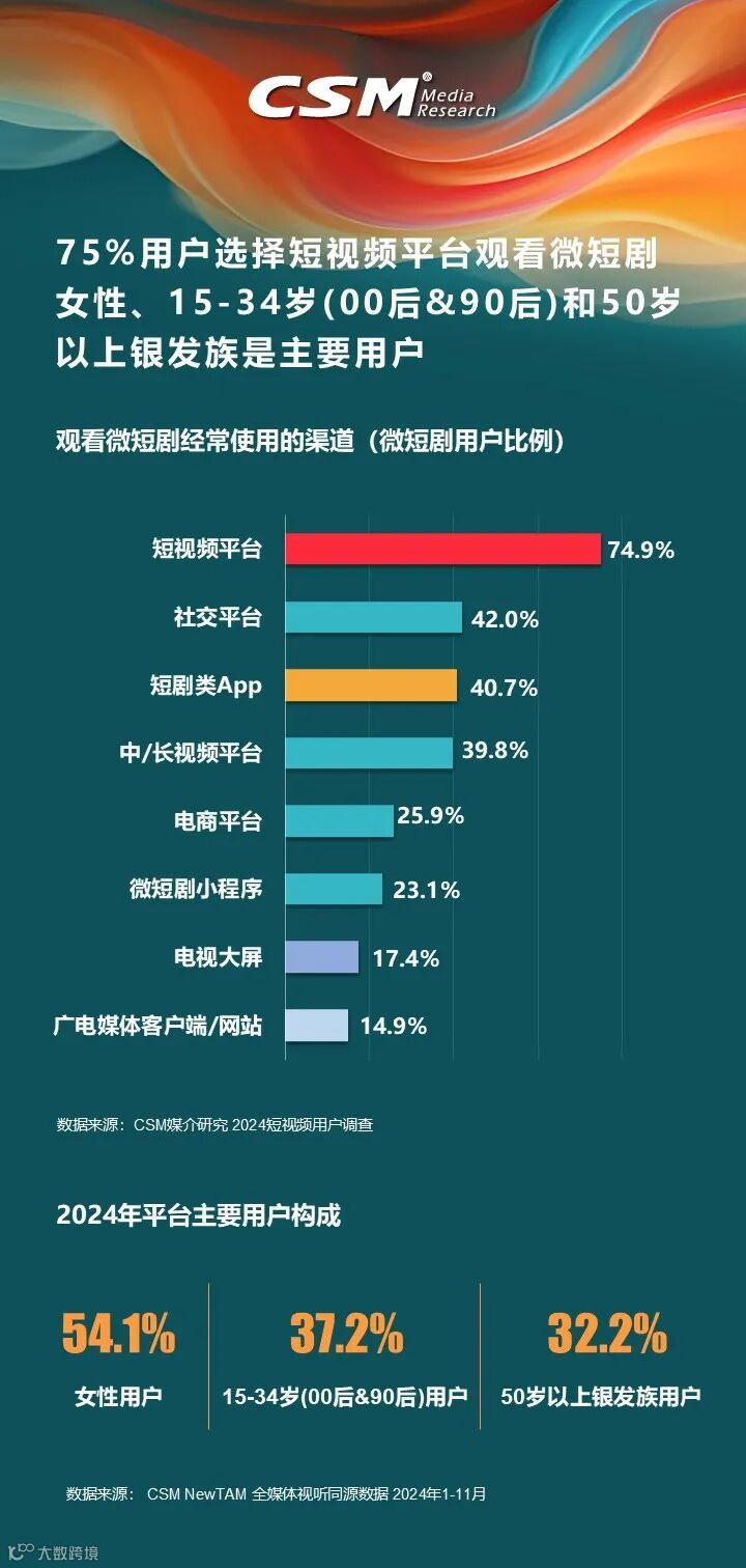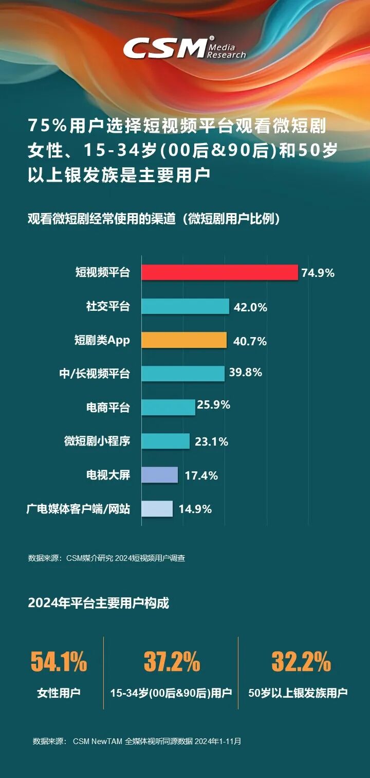 观看渠道层面,CSM媒介研究2024短视频用户调查显示,通过短视频平台观看微短剧的用户比例高达74.9%;社交平台、短剧类App及中/长视频平台处于观看渠道的第二梯队,选择占比均在四成左右,通过电视大屏及广电客户端观看微短剧的用户占比分别为17.4%和14.9%。CSM NewTAM全媒体视听同源数据显示,2024年,微短剧女性用户超54%,00后&90后用户比例超37%,银发微短剧用户占比超32%,是短剧主要视听用户。
