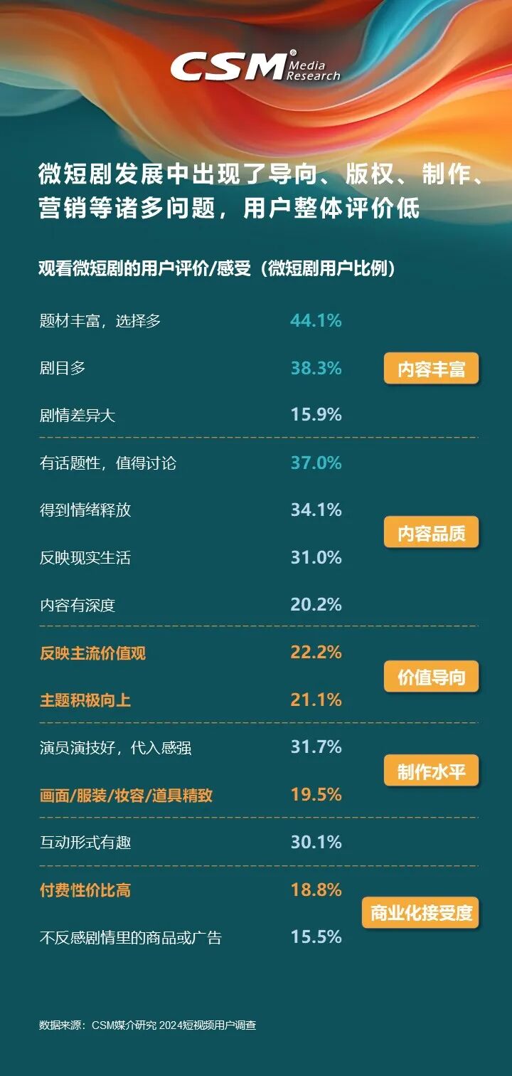 微短剧拥有庞大的用户需求,但其内容质量却远远未能满足用户期待,市场快速发展过程中,出现了“霸总”“恶婆婆”等价值导向偏差、 盗版侵权、微短剧付费乱象等问题。CSM媒介研究2024短视频用户调查显示,微短剧用户整体评价低,仅有31.0%的用户认为微短剧能够真实反映现实生活,22.2%的用户认为其主题符合主流价值观,19.5%的用户认为微短剧画面/服装/妆容/道具精致,18.8%的用户认为微短剧的付费性价比高。