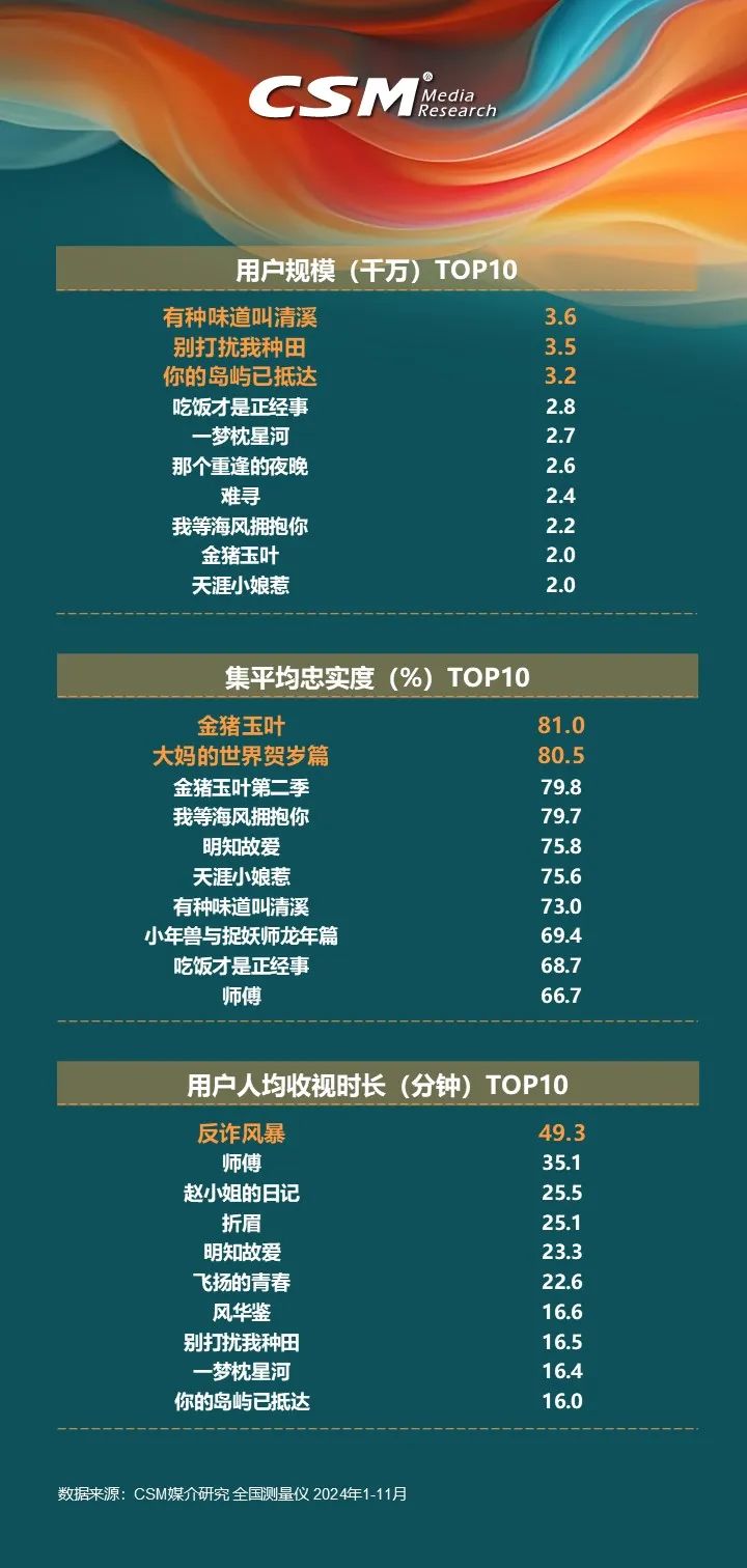 拓宽传播场景,微短剧登陆大屏,2024年1-11月省级卫视25部微短剧总触达近9亿人次,用户规模达1.6亿,“ 微短剧+文旅”、反诈等剧目吸睛。