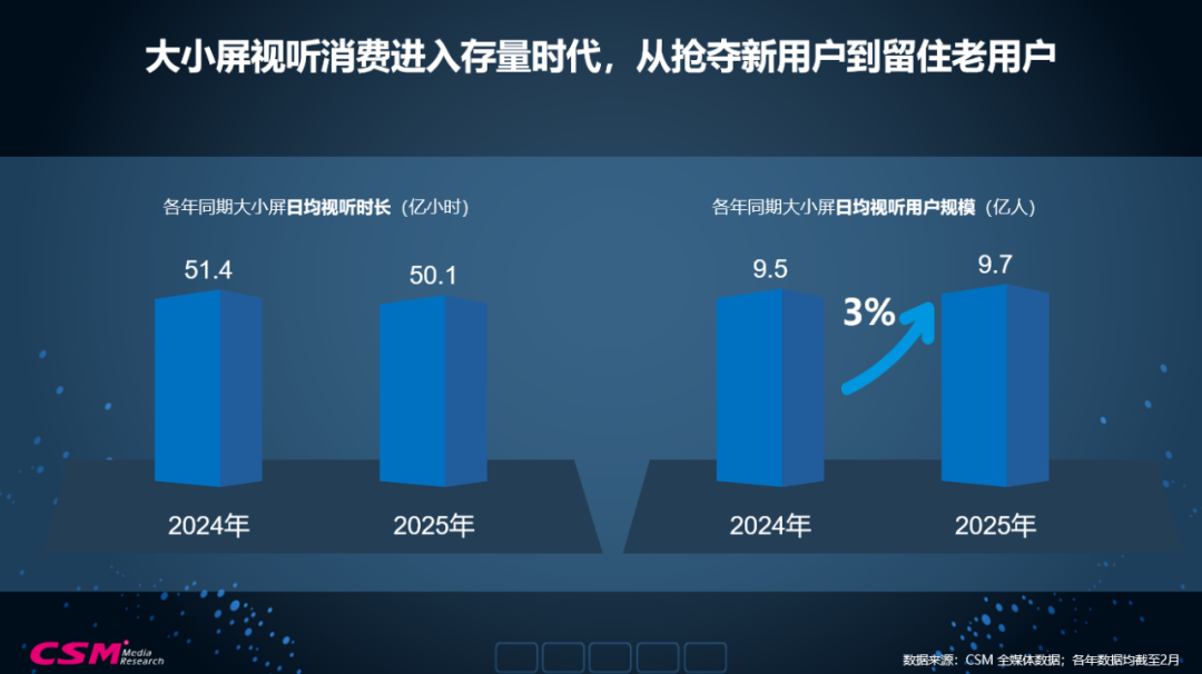 媒体融合的十年,视听边界逐年扩展,2025年趋于稳定。2025年1-2月大小屏视听日均时长稳定在50亿小时,日均用户9.7亿人。增速由高速转向平稳,反映市场从“野蛮扩张”进入“精耕细作”。