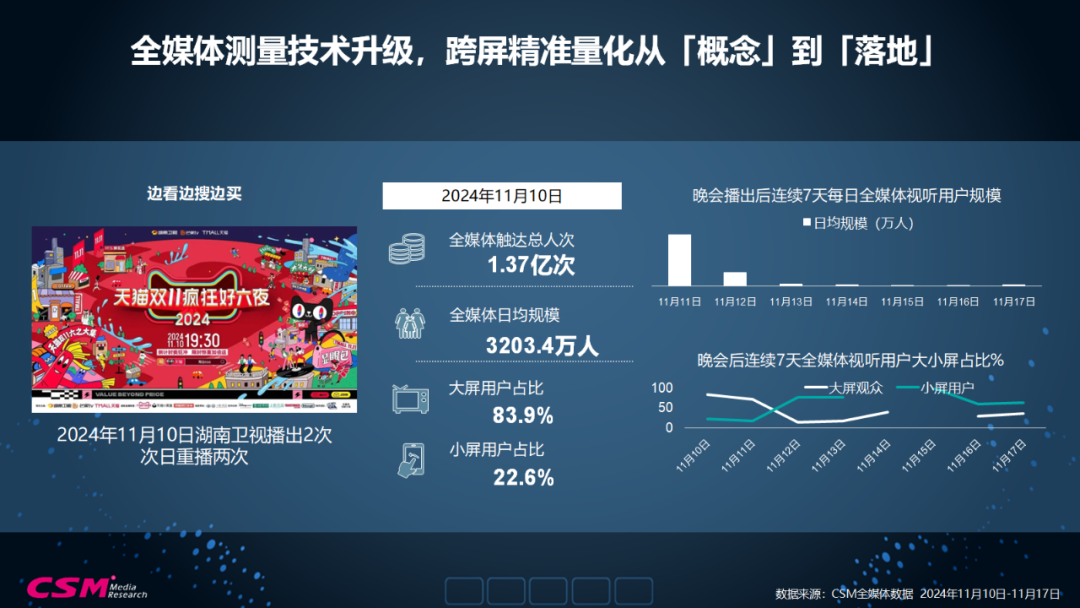 全媒体测量技术升级,跨屏精准量化从概念到落地。当下跨多屏的行为已成常态,CSM全媒体数据实现了以人为核心的跨屏精准量化。例如去年天猫双11晚会大小屏均有播出,可以精准统计其当天全媒体触达总人次、日均规模、大屏观众、小屏用户;还可以进一步测量点播回看的观众行为。如果再深挖,也可测量收看晚会的观众有多大比例流向天猫APP。
