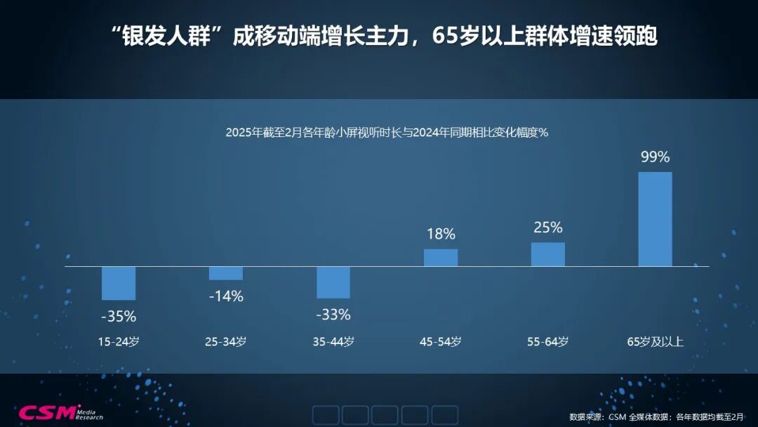 小屏视听时长增长主要体现在“银发人群”,65岁以上群体小屏视听时长较去年同期增长近一倍,增速在全年龄段领跑。“银发人群”成为大、小屏重要的消费群体。