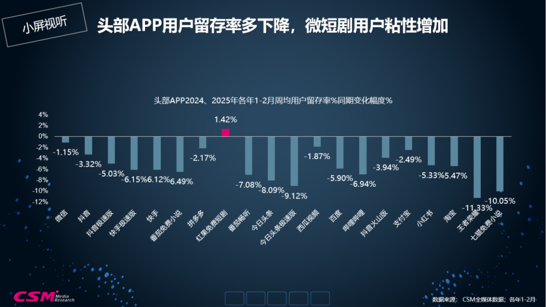 头部APP用户留存率普遍下降,用户留存成本攀升。2025年1-2月头部APP周均用户留存率较去年同期普遍下降,只有微短剧逆势增长。