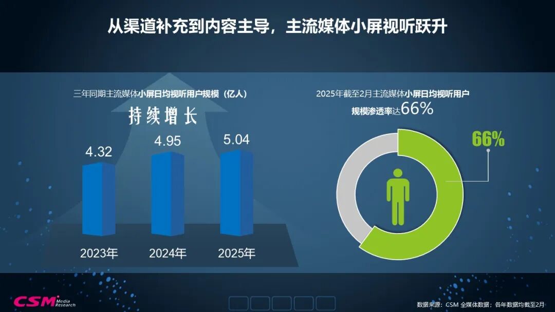 从渠道补充到内容主导,主流媒体小屏视听跃升。近三年同期主流媒体小屏日均视听用户规模逐年增长,2025年1-2月其日均视听用户占所有小屏日均视听用户的66%。