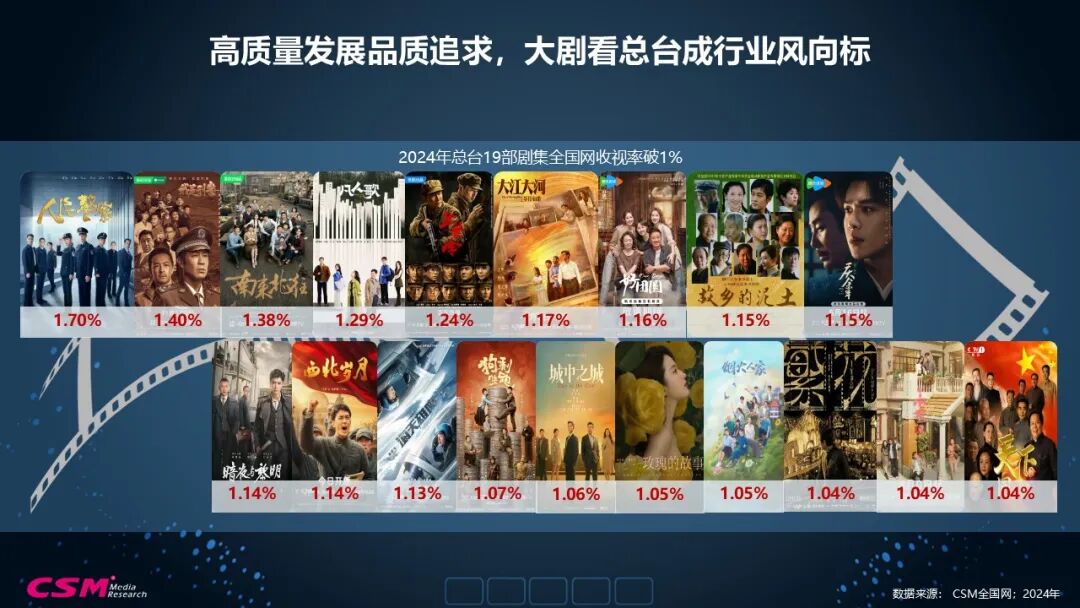 近几年,中央广播电视总台多个频道在大屏收视屡创新高,与其满屏精品的高质量发展布局密不可分。例如2024年,总台电视剧包揽全国网收视率前20席; CCTV-8在中心城市2024年收视份额达4.18%,创二十二年新高。这些剧目除在大屏收视高外,在新媒体也获得了强势传播效果。