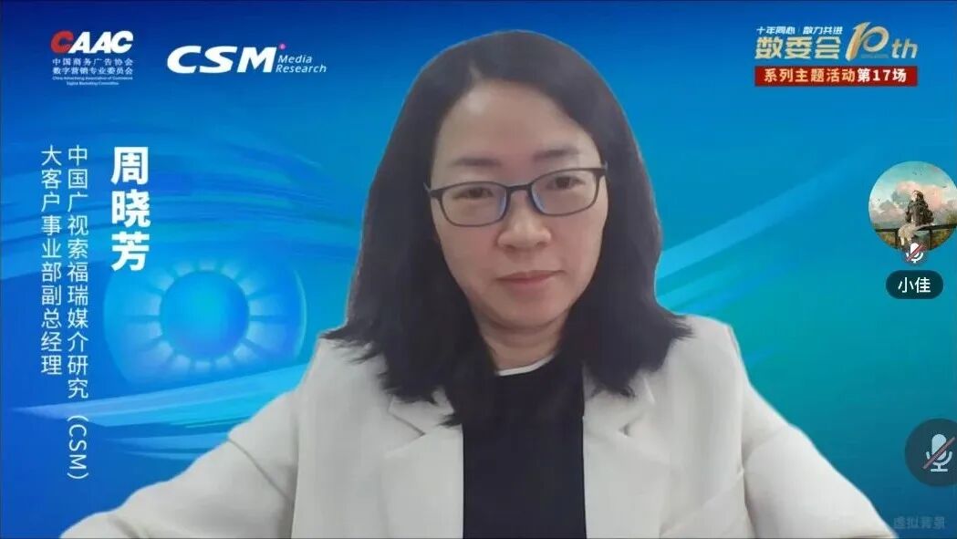 今日,中国广视索福瑞媒介研究有限责任公司(CSM)联合中国商务广告协会数字营销专业委员会共同举办主题为“2025全媒体数据洞察—视听格局重构与精品内容价值升维”云端思享汇,CSM大客户事业部副总经理 周晓芳 分享了CSM对2025年全媒体视听市场的深度洞察。