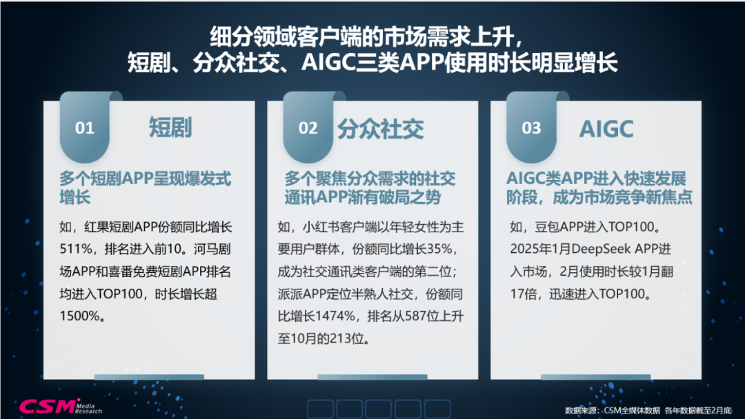 新兴赛道窗口期缩短,红果APP仅用1年实现从行业新锐到TOP10的跨越,AIGC类APP平均3个月完成市场教育到规模化增长;同时看到,用户需求分层,分众社交APP例如小红书等增长。