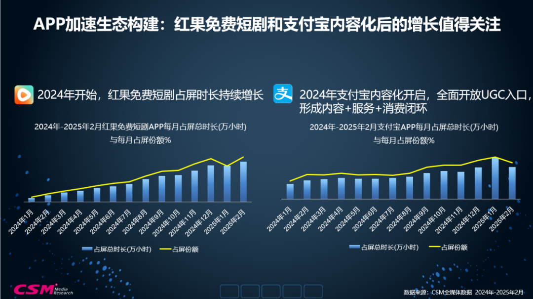 APP加速生态构建,努力围绕用户增加覆盖和留存。小红书从基础人群标签到细分人群标签再到覆盖多元生活场景及价值向的组合标签,围绕不同用户需求内容分层。红果以“免费观看”为核心策略,加速泛娱乐的生态构建。支付宝则从2024年开启“内容+生活服务+消费”闭环。