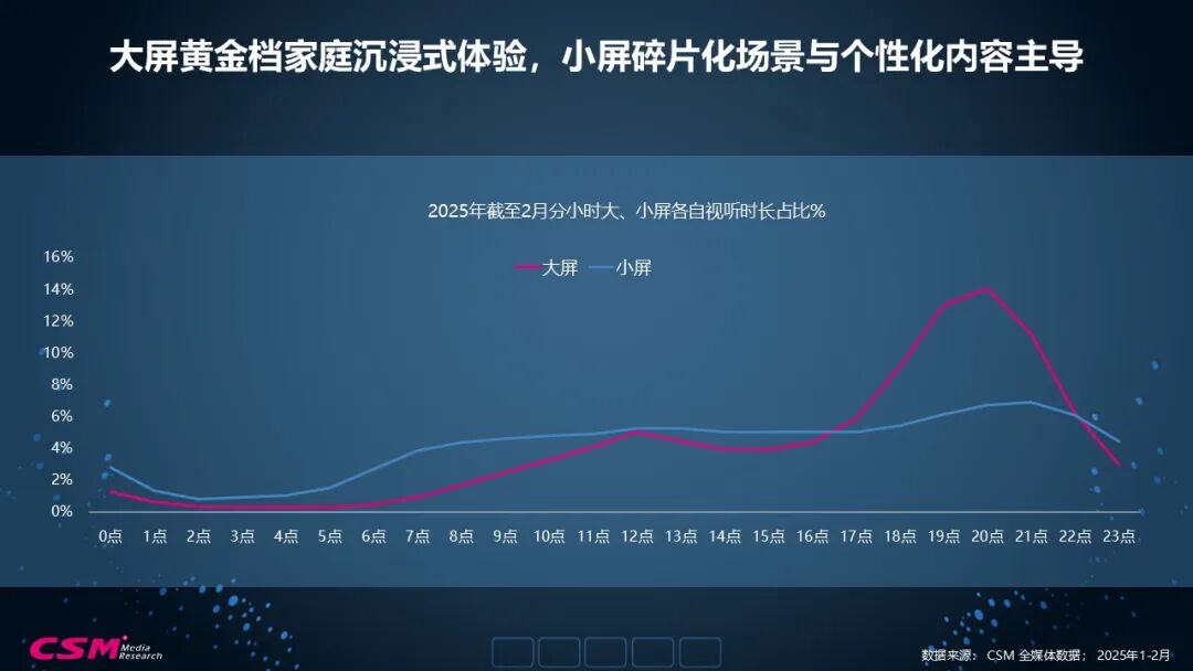 大小屏并非零和博弈,而是通过场景化分工与协同,共同满足用户多元需求。大屏黄金档家庭沉浸式体验,2025年1-2月19:00-22:00贡献44%视听时长;而小屏视听场景则更为碎片化。