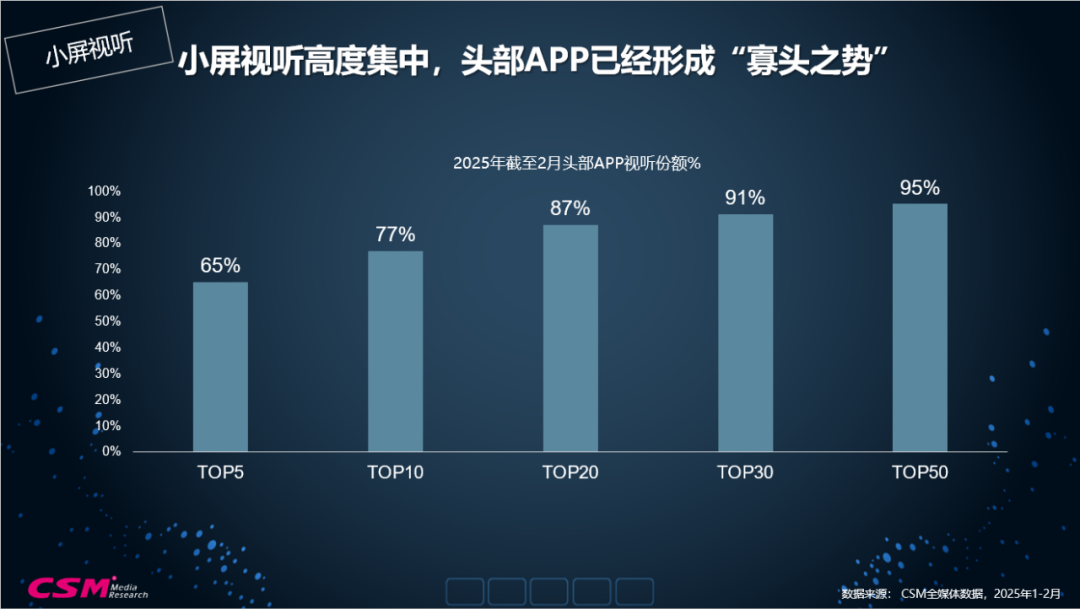 在视听场景下,APP消费时长高度集中。2025年1-2月,TOP5的APP视听份额达65%,TOP50的APP则占领了95%的份额空间。