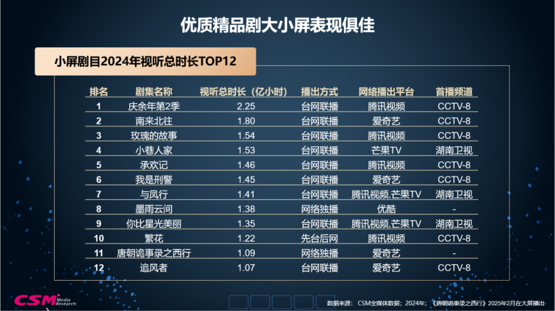 大屏高收视的剧目在小屏视听表现也名列前茅,2024年小屏视听总时长过亿小时的剧目有12部,其中有10部是台网均播出的剧目。《庆余年》《南来北往》《玫瑰的故事》《我是刑警》《繁花》等都是大屏耳熟能详的剧目。国民爆款基本都是台网均播的产物,当然,只有优质精品剧才能实现广泛传播,才具有反复观看的价值。