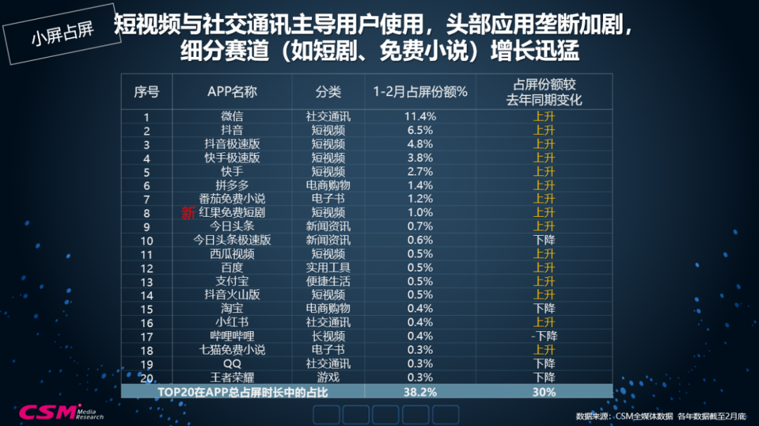 在占屏场景下,TOP20APP占屏份额38.2%,APP使用市场更多垂类细分。长尾应用细分赛道爆发式增长 ,红果免费短剧、番茄免费小说增速远超行业平均;泛新闻资讯类分化,今日头条主应用增长,极速版下降;传统应用面临挑战,电商领域拼多多逆势增长,淘宝下滑;社交通讯中QQ、游戏类王者荣耀等老牌应用下降。