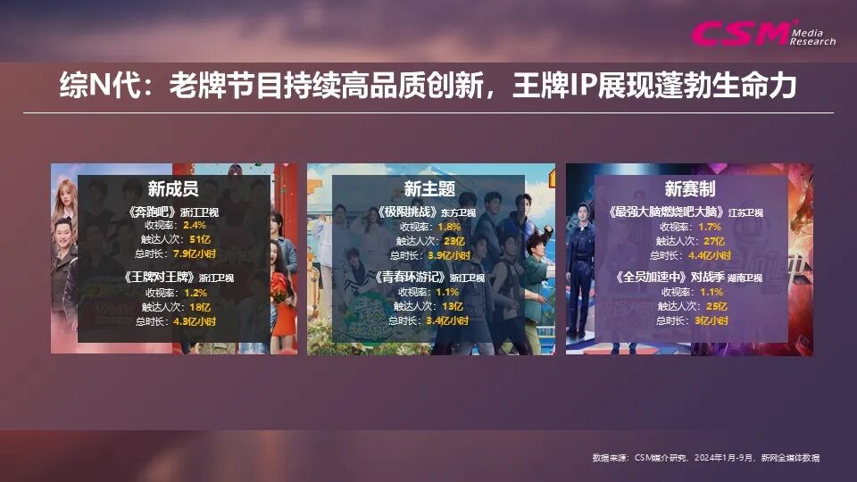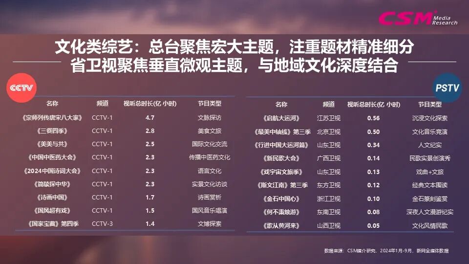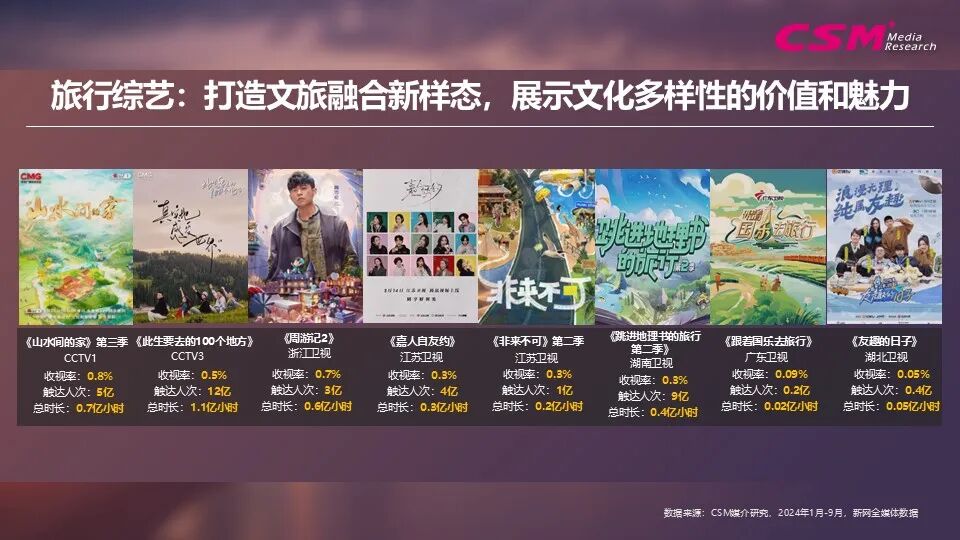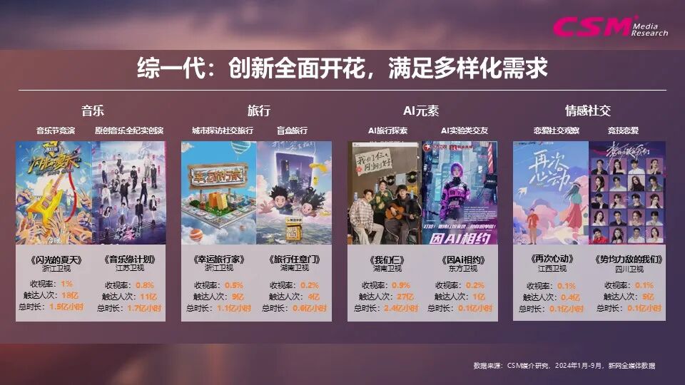 文化类综艺方面,总台聚焦宏大主题,省级卫视则与地域文化深度结合。旅行综艺展示了文旅融合新样态,音综形式各异,综N代节目持续创新,满足了多样化需求。