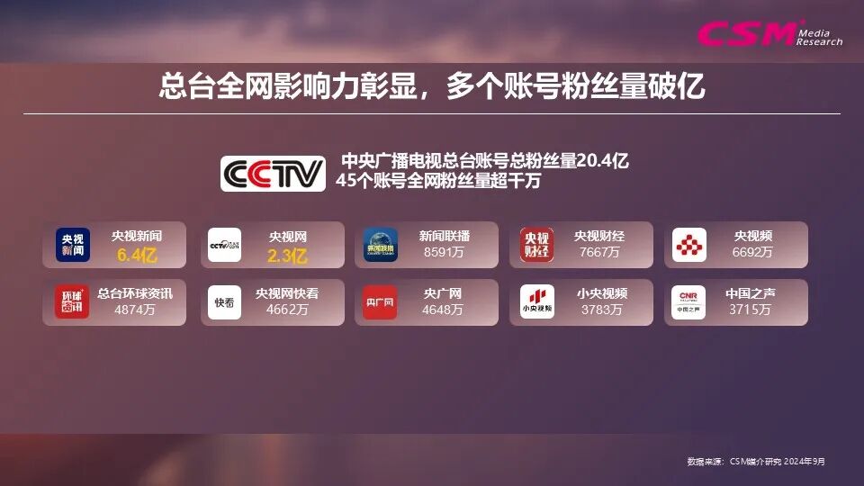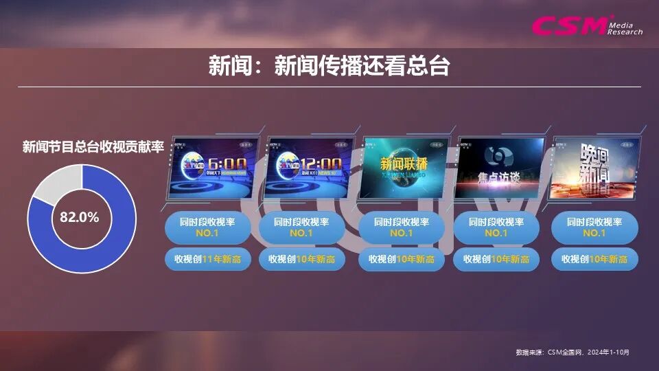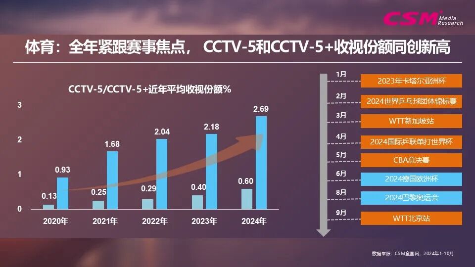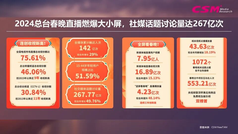 此外,2024总台春晚直播在大小屏引发热烈反响,社媒话题讨论量达267亿次。体育赛事方面,CCTV-5和CCTV-5+收视份额创新高,全年紧跟各项重大赛事。