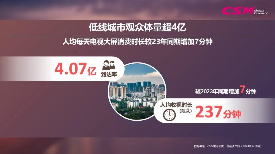 低线城市在电视市场中占据重要地位,观众体量超4亿,人均每天电视大屏消费时长较2023年同期增加7分钟,达到237分钟。中央级频道在低线城市直播收视份额近35%,显示出强大的影响力。低线城市居民具有较高的可支配收入和较强的品牌意识,吸引了高端人口流入,形成了巨大的营销市场。