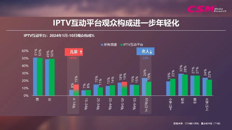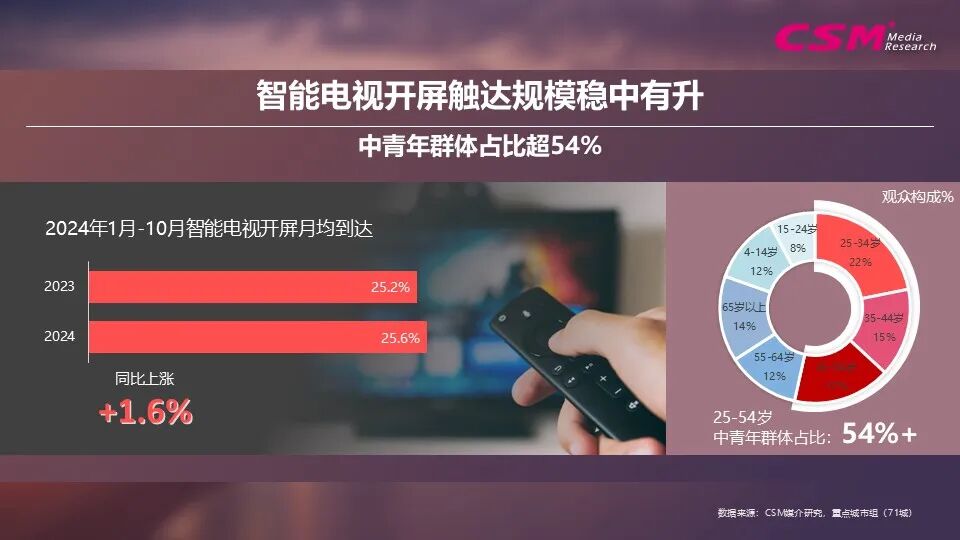 2024年电视大屏直播频道收视份额回升,IPTV互动平台观众进一步年轻化,4 - 14岁观众占比增加,65岁以上观众占比减少;OTT互动平台能覆盖更多高学历观众,儿童和青中年观众占比有所提升。智能电视开屏触达规模稳中有升,中青年群体占比超54%,比去年同比上涨了1.6%,少儿和老年人看开机广告的机会更高,智能电视开屏平均每天1.37次。