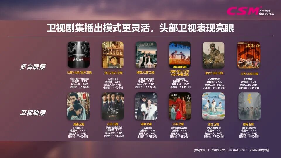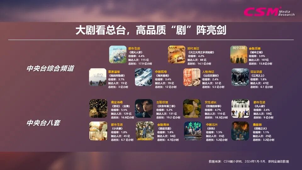 电视剧领域,前三季度央卫视播出71部优质新剧,现实题材占主导,台网同播剧热度高,大剧如《繁花》《庆余年第二季》等在总台播出成绩斐然,卫视剧集播出模式多样,头部卫视表现亮眼。