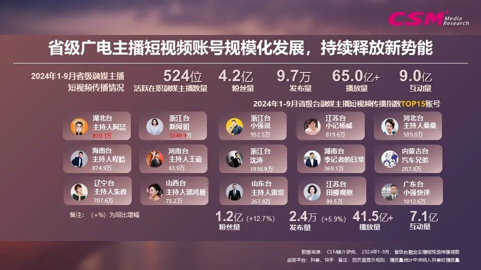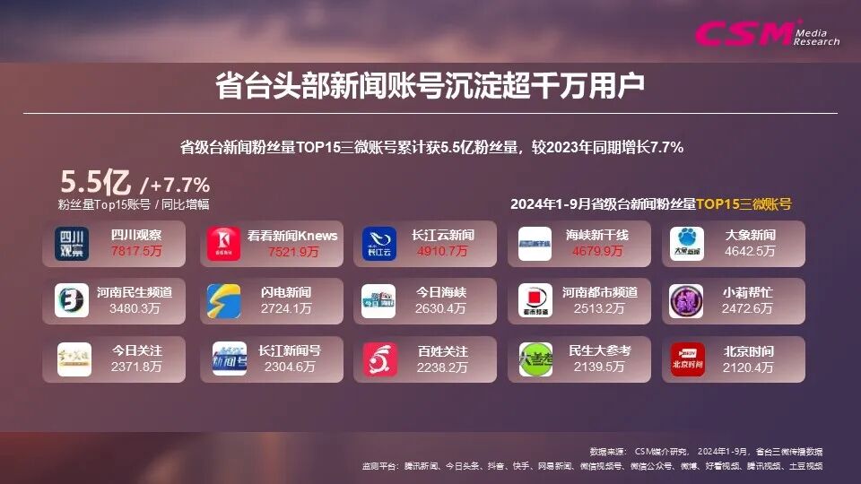 在媒体融合进程中,主流媒体的影响力不断扩大。总台全网影响力显著,多个账号粉丝量破亿,其中央视新闻粉丝量达6.4亿,央视网2.3亿粉丝。总台账号总粉丝量达20.4亿,超45个账号全网粉丝量过千万。省台头部新闻账号粉丝量增长迅速,省级台新闻粉丝量TOP15三微账号累计获5.5亿粉丝量,同比增长7.7%。综N代节目账号也展现出强大的粉丝吸附力,省级台剧综粉丝量TOP15三微账号累计获3.7亿粉丝量,同比增长4.7%。在融媒的传播中,在小屏传播中,广电机构的账号在不知不觉中已经成为非常重要的传播力量,省级广电主播短视频账号规模化发展,2024年1 - 9月,省级融媒主播短视频发布量达4.2亿,播放量41.5亿+。广电主流媒体在用户评价中表现出色,在广泛触达、内容品质、专业性等多方面获得高度认可。