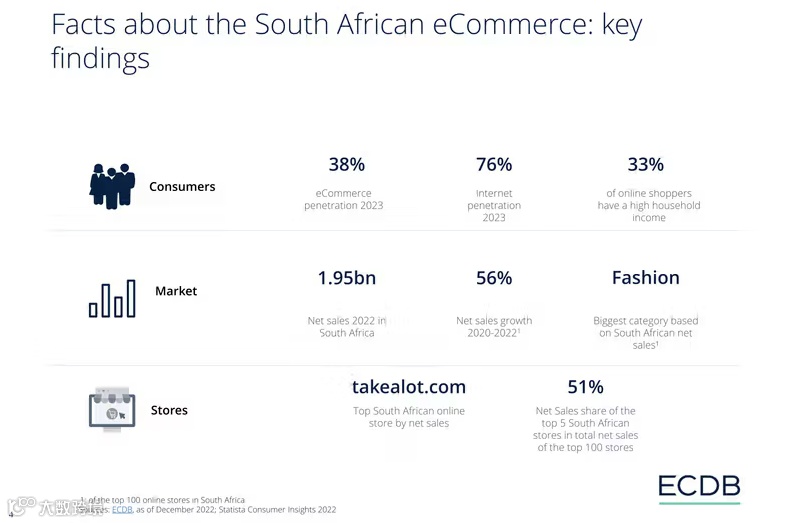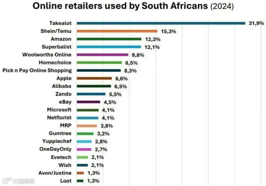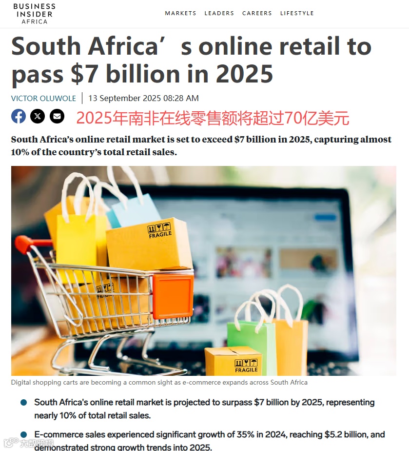 南非电商的增长速度已经远超实体零售十倍以上,去年一整年的线上销售额增长了35%,高达50亿美金,预计2025年南非电商销售额将会突破70亿美金。