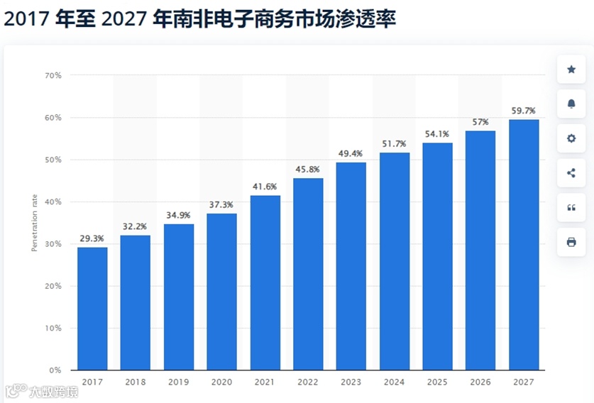 通过很早之前的一份报告数据显示,电商渗透率在非洲国家排名榜首,在2023~2027年间,南非电商市场的渗透率预计还会提升10个百分点,且会在2027年达到60%的顶峰。