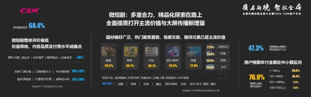 目前用户对微短剧的评价整体偏低,价值导向、内容品质及付费等均是痛点,对于被认为具有流量撬动力的"情绪价值",仅有34.1%的微短剧用户表示"看剧过程得到情绪释放"。针对诸多行业问题,主管部门出台治理政策,主动出题,实施创作提升计划,主流媒体积极入局,行业各方合力将加速微短剧的专业化、精品化发展,打开主流价值与大屏传播新增量。
