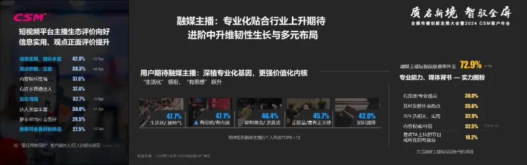 融媒主播的专业化特点贴合行业上升期待,迎来发展机遇期。短视频用户对商业平台达人/主播的认知与期待更为成熟,从分项评价来看,认可率、提升幅度最高的是达人/主播提供的“信息实用丰富”“观点积极正面”,主播群体的职业化发展处于上升通道。用户对于融媒主播短视频的观看比例升至72.9%,增长11.3%,在观看意愿持续增强的同时,融媒主播的专业化能力和个人价值内核也受到更多关注,如观点有深度、及时反映社会热点,有思想、讲真话、有正义感等,这为融媒主播的竞争突围,提供了良好的用户基础和职业发展环境。