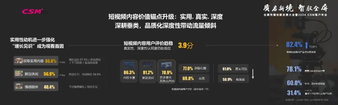 在使用收益上,内容的真实性、深度性始终是未被充分满足的需求。短视频的内容评价与去年持平,趋稳于3.9分(满分5分)。在具体评价项上,比较大的变化是,用户对于“更多看到重大及热点事件内容”的认同比例增长超过3个百分点,连续两年仅次于“内容丰富”“更新及时”,主流媒体在第三方平台的内容分发功不可没;对短视频内容 “真实可信”“有深度”的评价持续处于低位,且较前有所下降。