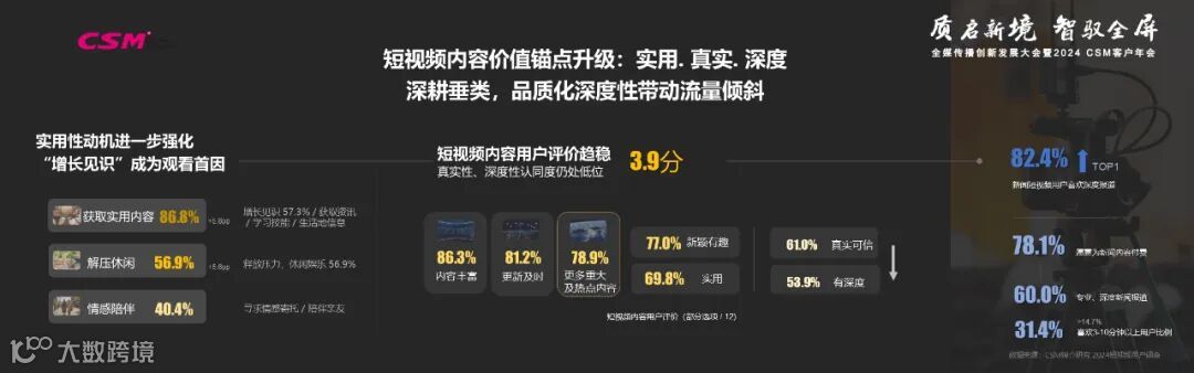 海量碎片化和信息茧房式的内容越多,对深度内容的需求刚性越强。对短视频深度内容的需求,反映了用户在内容使用中,对效率感、获得感、价值感及深度共鸣的更多关注。这首先对短视频的信息及其价值密度提出了要求,一方面,在小体量载体中的表达需要基于短视频特性的深度适配;另一方面也意味着,在垂类领域继续向下深耕细分赛道。