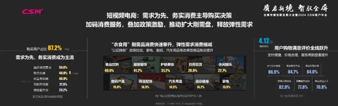 过去半年,87.2%的用户在短视频平台购买过商品/服务,较2023年增长5个百分点;短视频电商购物的满意度评价提升,涵盖商品价格、品类、销售服务、在线支付、物流等消费环节,短视频平台成为日常消费场景。