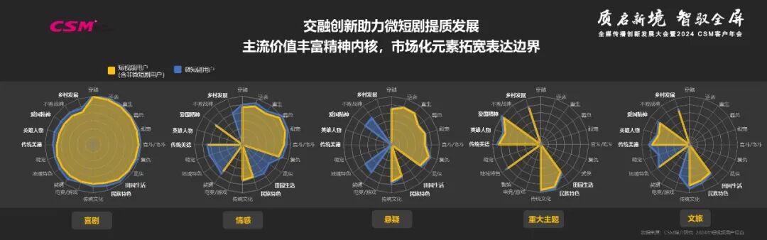 对题材和元素的进一步交叉分析发现,市场上热门题材的元素容纳度较高,比如喜剧、情感类等,用户既希望看到商业化、世俗化元素,也给主流价值元素留出了空间。但在用户的认知视野里,具有主旋律、主流价值特点的重大主题、军事等题材,元素容纳性相对单薄,这是惯性,也是看不见的束缚,但这恰恰为微短剧这种高度市场化的内容形态与主流价值表达的结合,创造了突破的缝隙和创新进入点。国庆期间,总局推荐的国庆档精品微短剧中,红色题材《我在长征路上开超市》《这世间如你所愿》均在现实场景中加入穿越元素,以主流价值丰富精神内核,以市场化元素拓宽表达边界,取得了较好的传播效果。这给我们一个启示,打开思路,用开放的心态看待微短剧,今天的微短剧不是明天的样子,就像短视频的初始状态与现在已全然不同。