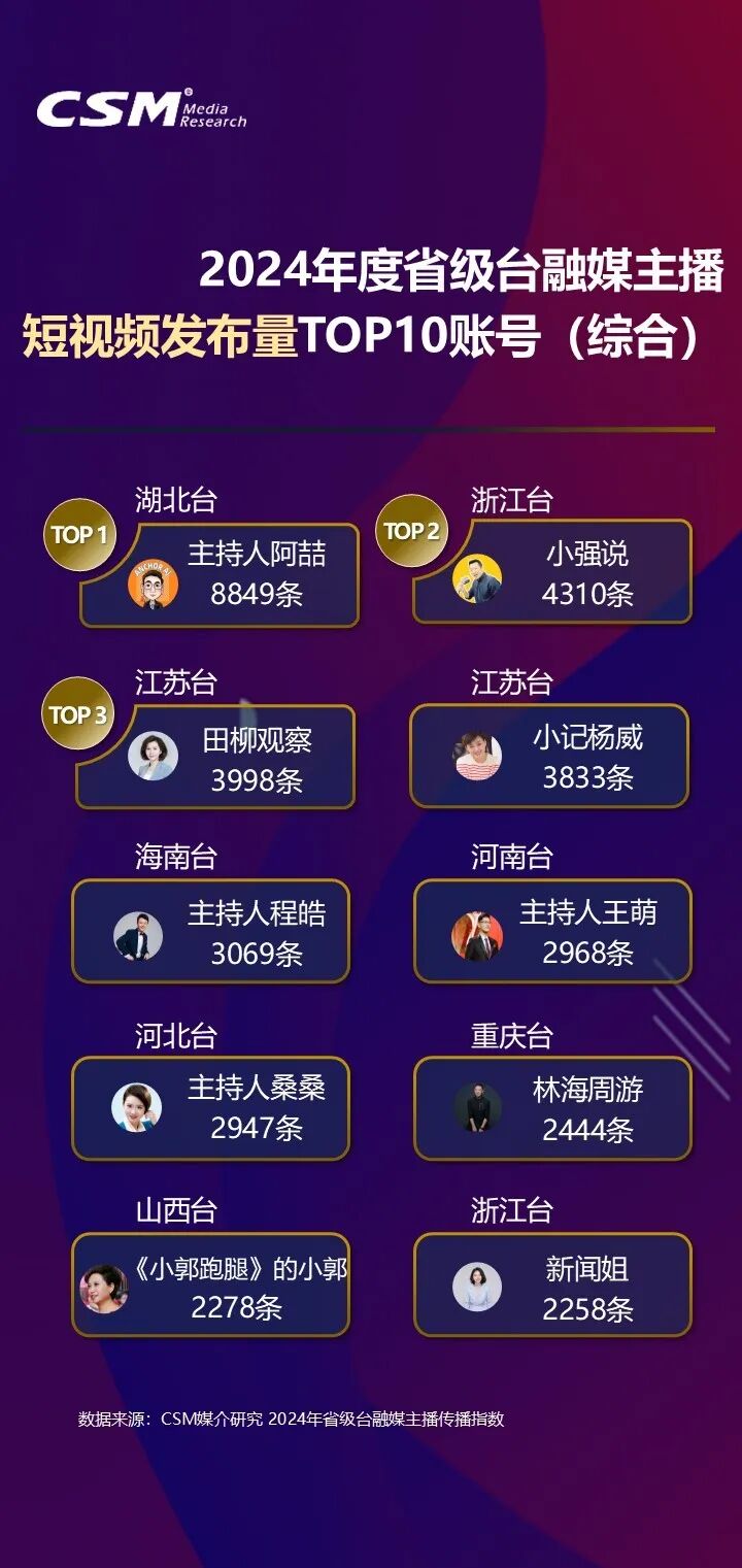 河南台@主持人王萌深耕新闻评论,传播力持续提升,拉动融媒主播传播指数首次进至TOP10,位列第七位。全年发布近3000条短视频,涵盖突发热点、国际局势等;2024下半年发布量环比提升74.6%,转发量上涨143.5%,其中“巴黎长荣桂冠酒店”单条内容传播量超4862.5万,居融媒主播2024年发布的同主题内容前列。