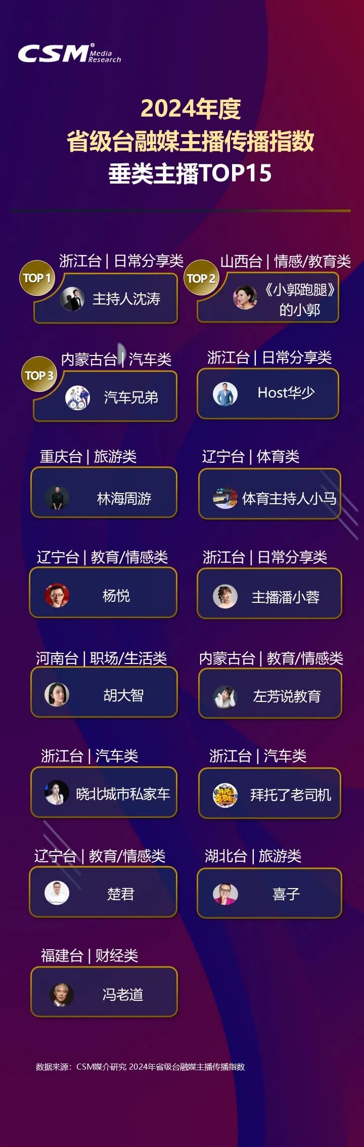 从2024年融媒主播传播指数TOP100(综合)看,垂类主播占位58席,数量较2023年基本保持持平,领域覆盖生活记录、汽车、教育/情感、职场生活、体育、家庭/亲子、文旅、财经、法治等。从传播情况来看,2024年垂类单账号平均传播量超2453.5万,仅为新闻账号的15.6%;与2023年的指数TOP100(综合)中的垂类账号相比,单账号平均传播量同比下降43.6%,仍待深耕突围。在细分垂类赛道中,汽车类主播占位8席,区别于其他竞争赛道,汽车领域更需要具备深厚的行业知识储备,而交通频道主持人长期沉淀忠实观众,助力其新媒体账号快速增长;此外,职场、文旅、体育等小众内容领域融媒主播,跻身融媒主播传播指数垂类账号TOP15。
