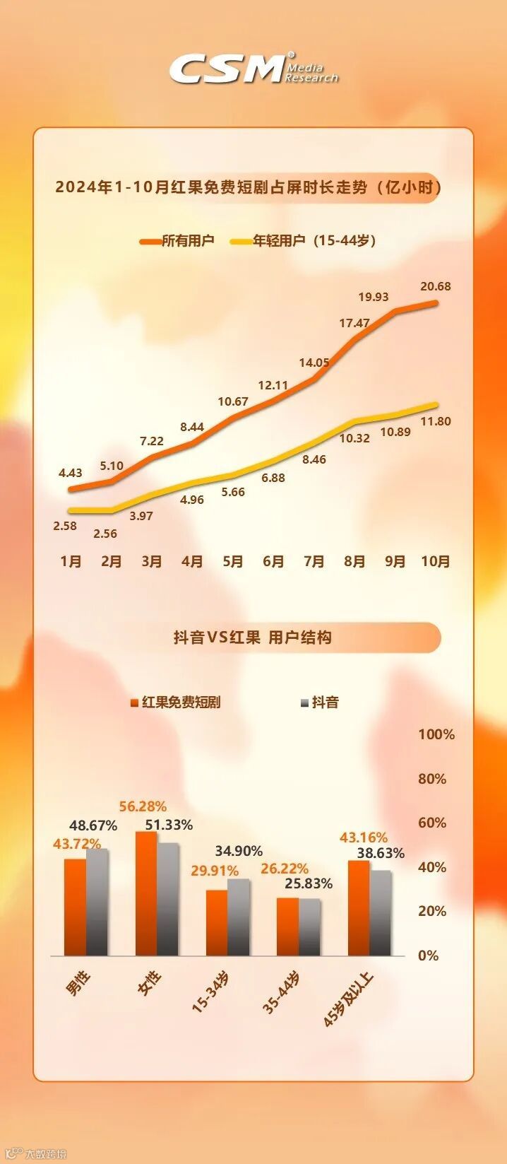 具体到短剧类APP,红果短剧的总时长依然位居首位。近年来,红果短剧的用户规模增速显著,用户使用时长逐月递增,至9月累计时长已突破100亿小时,10月势头强劲,单月时长超20亿小时。与抖音相比,红果短剧凭借其更为垂直的定位,成功吸引了更多银发族用户的关注与喜爱。