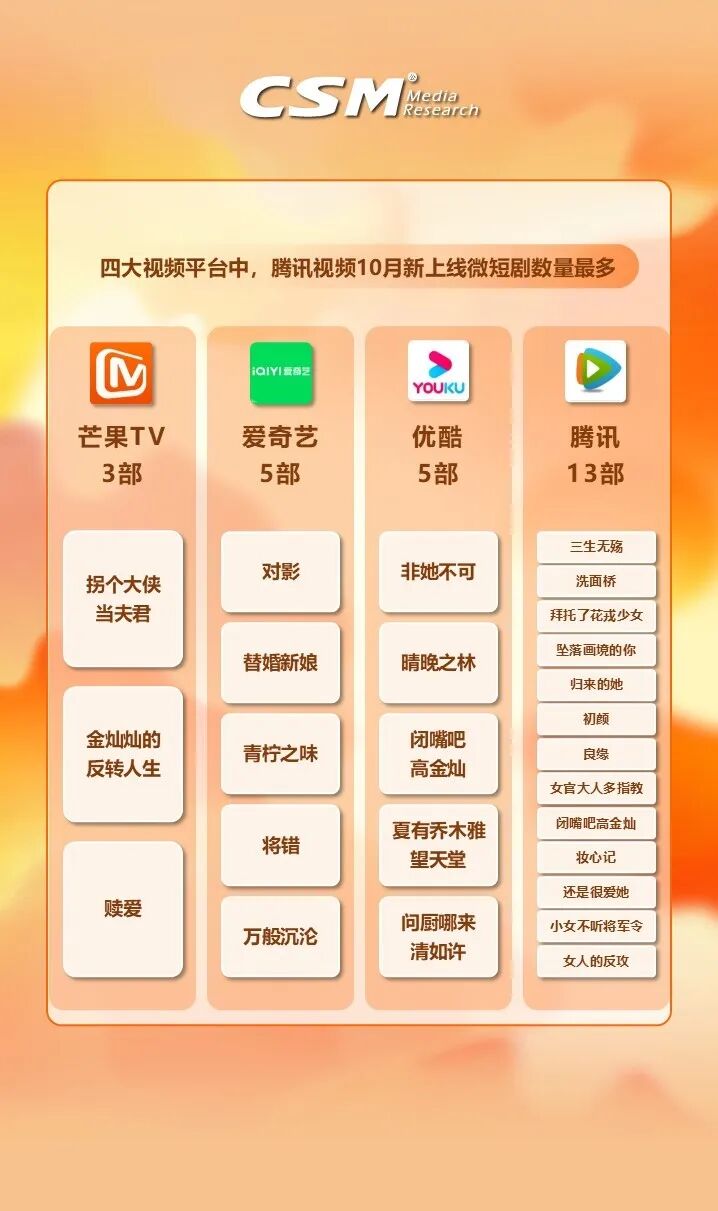 在各大视频平台上,微短剧的播出情况呈现出多元化的竞争格局。在四大平台中,腾讯视频以其显著的优势占据了领先地位,优酷紧随其后,爱奇艺虽稍显逊色,但在微短剧领域的表现依然值得业界关注。