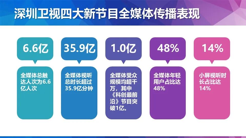 根据CSM NewTAM全媒体同源测量数据显示,播出3个月以来,深圳卫视四个新节目全媒体视听总时长超过35.9亿分钟,总触达超过6.6亿人次,年轻观众占比达48%,小屏视听时长占比14%。其中,《科创最前沿》的全媒体受众规模最高,播出3个月收获超过1亿的全媒体受众。