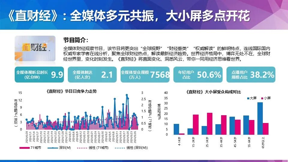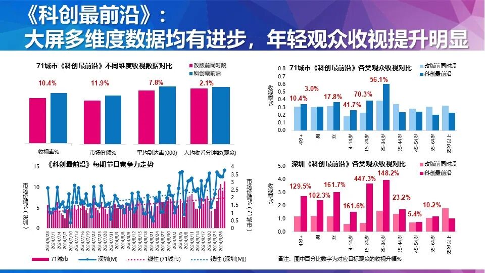 节目在大屏的表现也可圈可点。在71城市,节目在收视率、市场份额、日均观众规模和观众人均收视时长方面均较播出前同时段有不同程度的上升。节目自开播以来,在71城市和深圳的竞争力均呈现升势,4-35岁年轻观众的贡献犹大,在深圳的提升更为倍数级别。